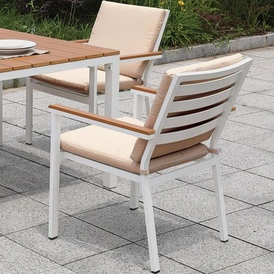 Whether it’s just you or guests have arrived for an afternoon in the sun, this set of 2 outdoor dining armchairs provides the perfect place to relax during a summer barbeque. The clean frame is accented with panels and finished off with comfortable cushions. The UV and water resistant design allows for endless hours for outdoor fun.