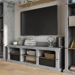 This 3-piece entertainment center makes a bold statement in your living room. The urban design features cement gray frames with wood-tone shelves. Two media towers display decor while a TV stand offers rear wire whole access for organizing consoles. Perfect for your rustic, casual, or farmhouse living room, the console boasts a low profile and six shelves for storage and display. Add decor to the upper shelves for a stylish look or fill the bookcase with media and games to keep you entertained for days.