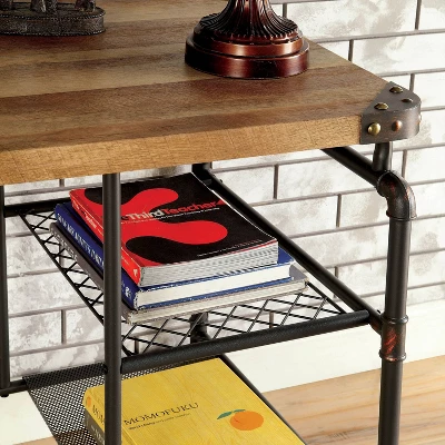 A well rounded industrial design theme incorporates this fashionable writing desk, adding a hint of farmhouse charm to complete a transitional decor scheme. Get to work on short tasks or long assignments on a desk built from replicated wood on its desk unit and side shelving. An antique black finish offers a vintage look on a metal frame with piping detailing and charming brackets. Set atop whimsical vintage wheels, this elegant and yet whimsical desk is a great find.