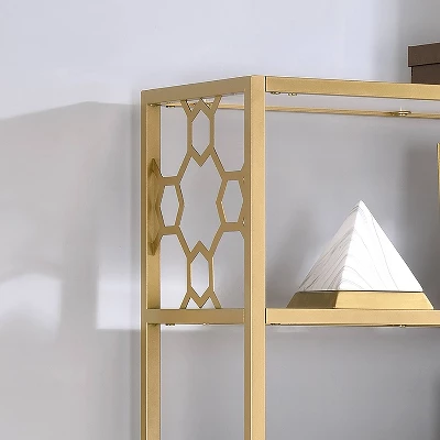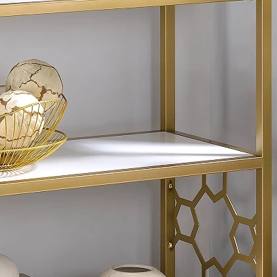 Your living room or home office is bound to feel a bit glamorous with this white bookcase. Made from steel, beautiful geometric designs on the frame make a stylish statement. This is a 5-shelf bookcase that is equipped to handle your book collection along with various decor items. With its open back design, it conveniently functions as a room divider.