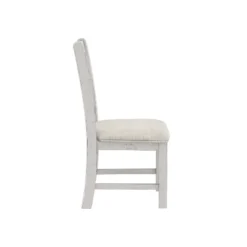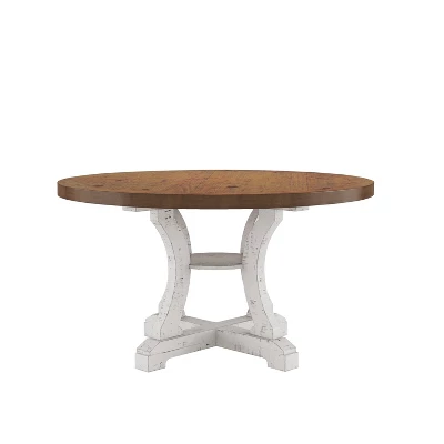 Bold style rules the day with this charming transitional seven-piece wood dining table set. Complete with six chairs and a round table, the set is ideal for a breakfast nook or eat-in kitchen. Its round table boasts a dark oak wood finish top resting on a modifier pedestal base that includes a small, round shelf. Chairs and the table base feature an antique white finish that creates a rich two-tone look.