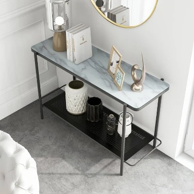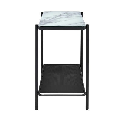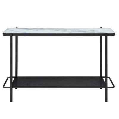 Transitional in design, this black and tempered marble glass sofa table is perfect for an urban home. The unexpected style combines a classic white marble-like tabletop with an urban metal lower shelf. This extra storage surface features a mesh structure that contrasts the tabletop in an artistic expression. Blending style motifs to create a truly engaging design.