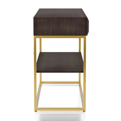 Use this unique sofa table to decorate your entryway hall or living room. The panel inspired design on the front side is 2-concealed drawers that pull out on smooth metal glides. Let the table raised by a gold base frame be a place to collect your incoming and outgoing keys and mail.