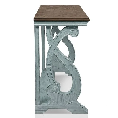An exceptional sofa table for any living room, this table features beautifully carved details fit for a king or queen. The tabletop is finished in dark oak and contrasts wonderfully with the white wash frame, featuring an ornate design and bold feet. This table serves as a design focal point on its own or you can enjoy adorning it with your own most-loved possessions such as photo frames of loved ones.