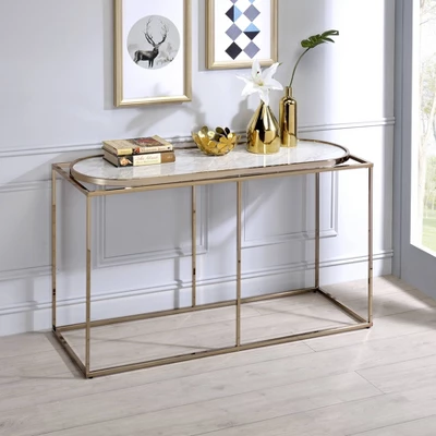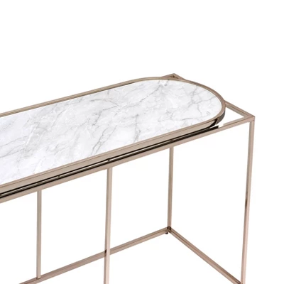 Establish a fashionable home with this chic champagne finished sofa table! The frame only appears to be a delicate design, as it is made from a sturdy steel base hosting an oval tabletop. A smart marble veneer completes the look. Gold decorations mingle amiably with these facades. Choose between an elegant black faux marble or a clean white faux marble tabletop.