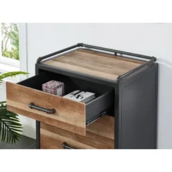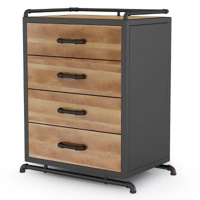 Augment an industrial design motif with the rugged details of this four-drawer chest. Perfect for adding storage to virtually any room, this versatile chest boasts four roomy drawers that stand ready to organize everything from clothing to office supplies. Drawer fronts boast a natural wood finish and are accented with pipe-style handles. The case of the chest rests on pipe legs and the top is traced on three sides with a pipe-like guard rail that adds authenticity to its design.