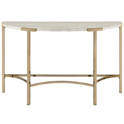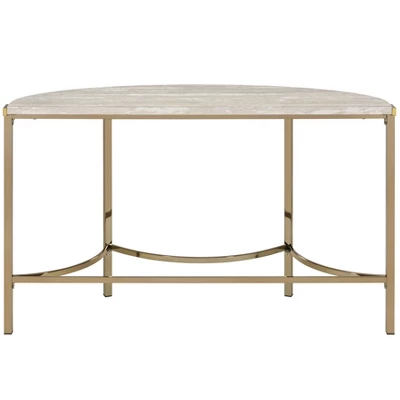 This Sofa Console Table transforms your living room with its sophisticated modern style. Flaunting a high-class look, this console table showcases a white and gray faux marble finish tabletop with beautifully coordinating champagne gold metal legs. Slip this elegant end table into your living room or home office to bring a glamorous allure to your decor. This console table brings an airy open style to any space. Try topping it with a vase of blooms for a charming entryway focal point or behind the sofa paired with a lamp for evening reading.