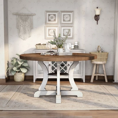 Create a charming touch of country style in your dining space with this distressed white and dark oak dining table. This round dinner table is beautifully supported by a pedestal base with a small center shelf for storage. The expansive tabletop creates an intimate environment for serving dinner spreads or enjoying quick snacks with the kids.