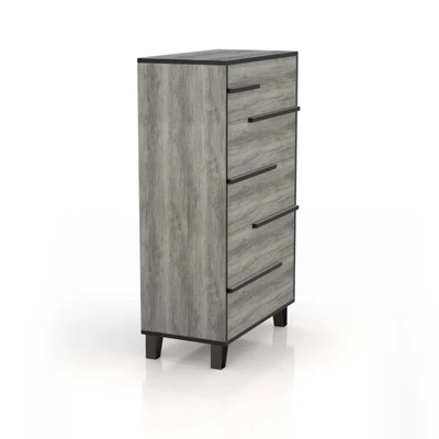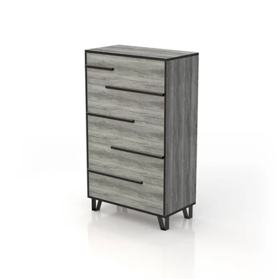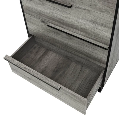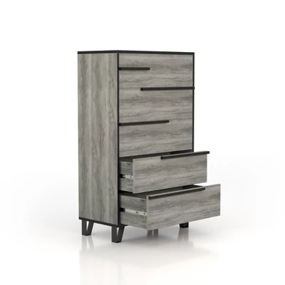 This 5-drawer chest lends modern industrial style to your bedroom or guest room. It’s made from engineered wood with a vintage oak finish that highlights the wood’s natural grain. This chest features a vertical rectangular silhouette and it stands on black hairpin-style legs for a contemporary touch. The 5 spacious drawers provide ample room for tucking away your clothing and linens. They’re accented with black metal drawer pulls for a sleek, streamlined look. Plus, a wall anchor is included for extra stability.