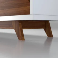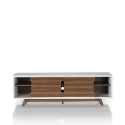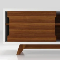 Flaunting a two-tone appearance and plenty of storage, this mid-century modern TV stand is equipped to enhance your entertainment area. Two sliding cabinet doors with cut-out grooves open to reveal shelving units inside. Easily conceal your media essentials for a clean and organized space, and enjoy accommodating your large TV of up to 72 inches.